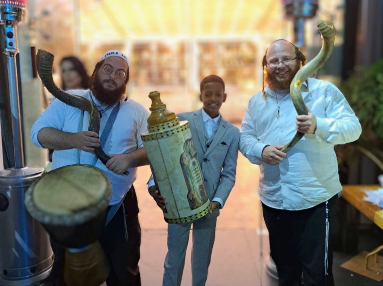 מחוץ לבית הכנסת, הרכב משמיע שירים וצוות המשמחים רוקד עם הילדים ויוצר אווירה שמחה וחגיגית